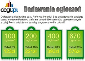 Skuteczna reklama internetowa! Mogę zareklamować Państwa produkty i usługi na wiele sposobów: dodać ogłoszenia na ponad 650 serwisów ogłoszeniowych z całej Polski (w tym kilkadziesiąt zagranicznych, ale polonijnych), pomóc w zdobyciu pozycji w Google dzięki podlinkowaniu Państwa strony internetowej nawet w 1500 katalogach stron, umieścić kolorowy banner reklamowy (lub inny rodzaj reklamy - do uzgodnienia) na wszystkich stronach www, nad którymi sprawuję kontrolę, zorganizować mailing reklamowy, czyli dostarczyć Państwa ofertę nawet do 15 tys odbiorców, którzy wyrazili zgodę na otrzymywanie reklam na swojego maila.